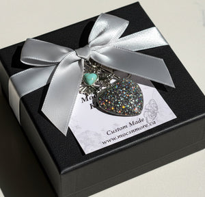Carry Indigenous artistry with you every day. This custom-made accessory features a stunning silver heart charm adorned with multi-colored sparkles and epoxy resin, paired with a distinctive brass Thunderbird charm on a silver chain.