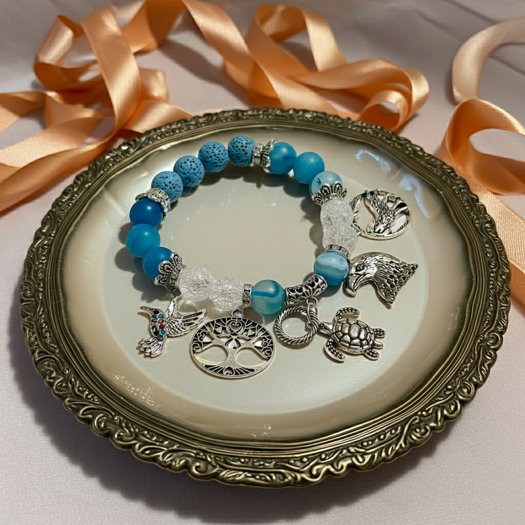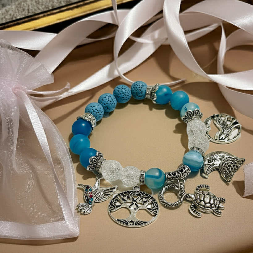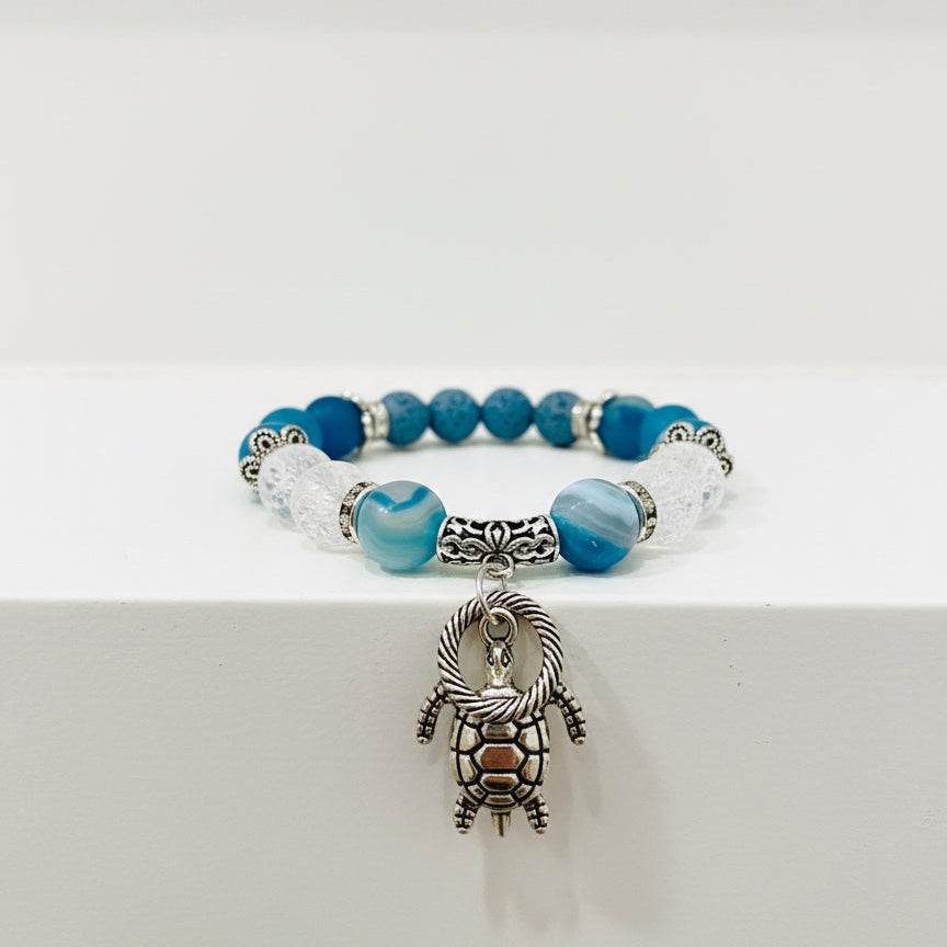 Blue Agate calms the mind while fostering clarity and open communication. Paired with cracked quartz—a symbol of transformation that amplifies intentions and activates chakras—and grounding lava stone for emotional release, this handcrafted bracelet channels spiritual intention into daily wear. Featuring 10mm semi-precious stones, delicate brass accents, and a comfortable stretch band, each piece is thoughtfully made at Mocs n More to support your wellness journey.