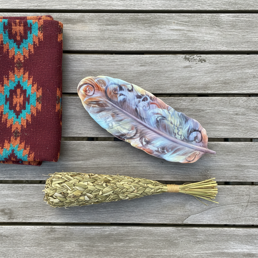 Top-down view with Aztec cloth and sweetgrass braid