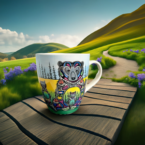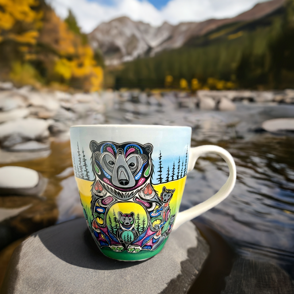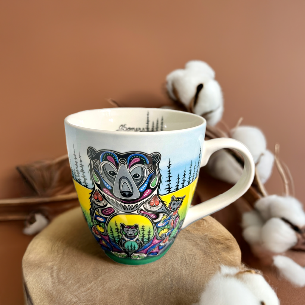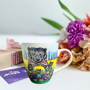 Indulge in our 18 oz Signature Mug - Medicine Bear., and adorned with authentic Indigenous designs and crafted from fine China. Not only are these mugs microwave and dishwasher safe, but they also support and compensate Indigenous artists. Each mug comes in a gift box with the artist's bio and signature, making it a thoughtful and exclusive gift. Designed in Canada with heart and soul.