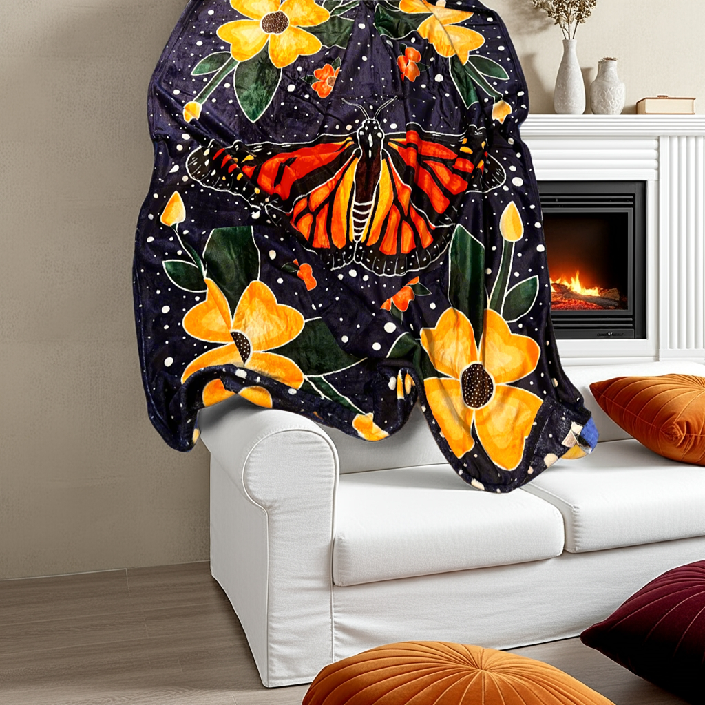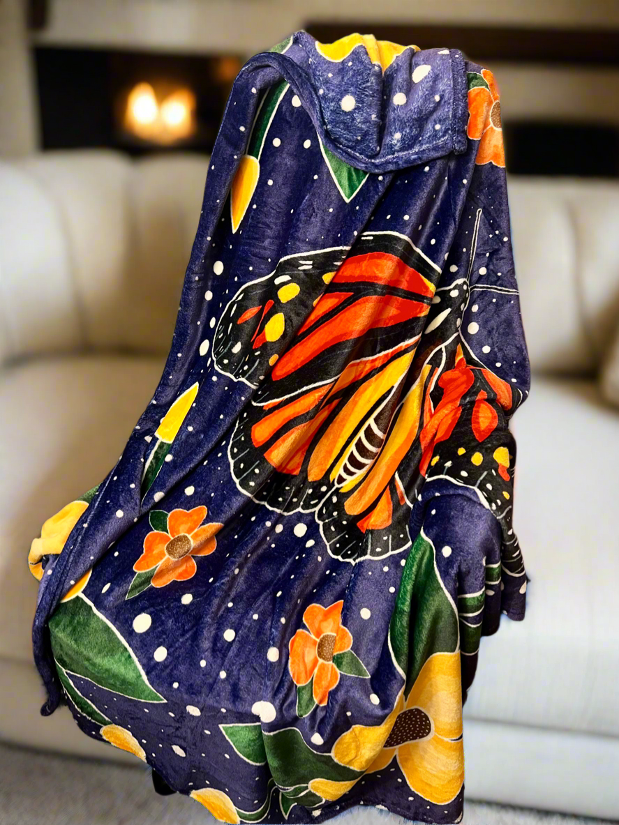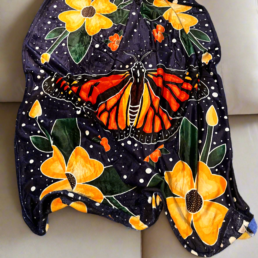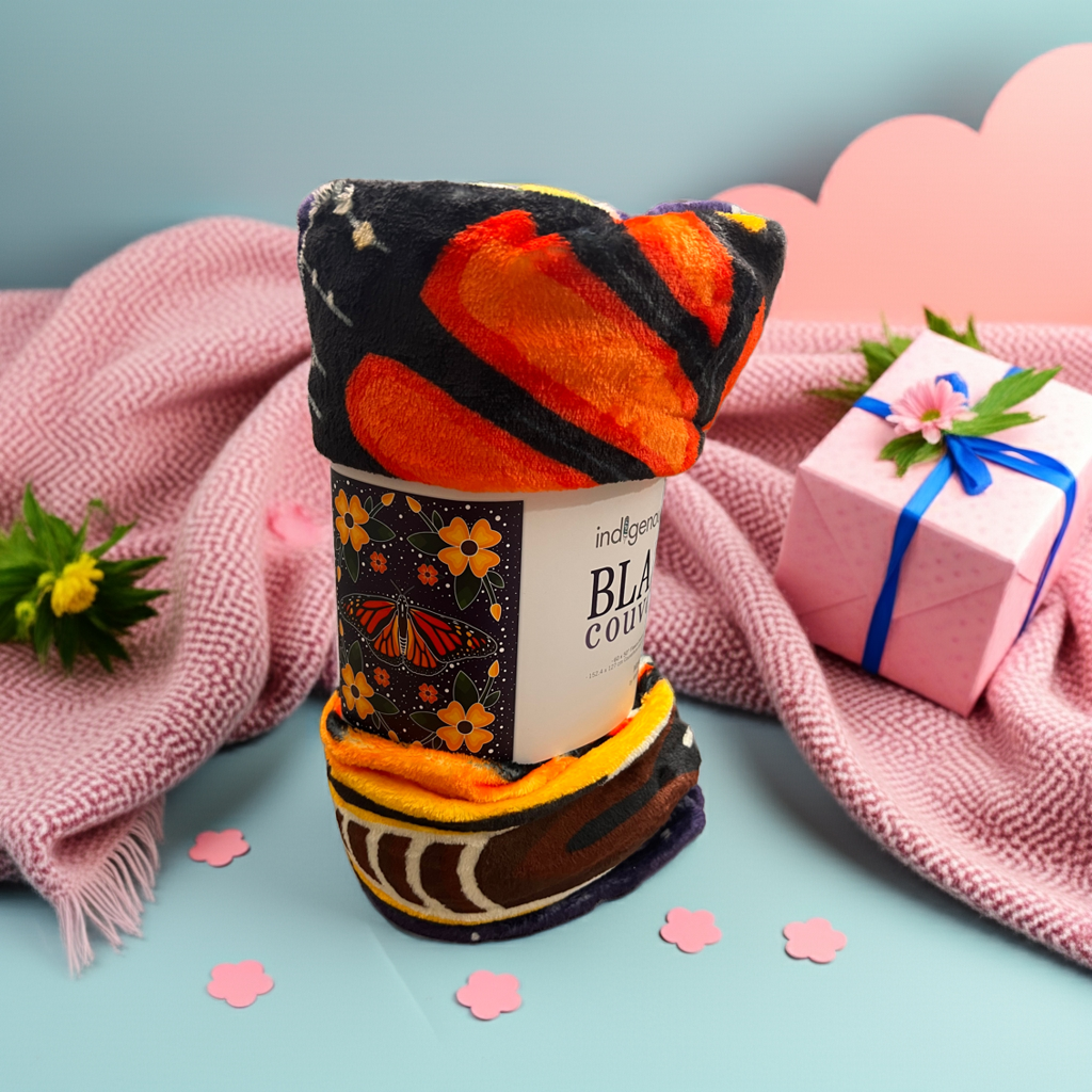 This Monarch Butterfly blanket beautifully blends traditional Indigenous artistry with modern comfort, creating a meaningful piece that honors culture while providing cozy warmth.