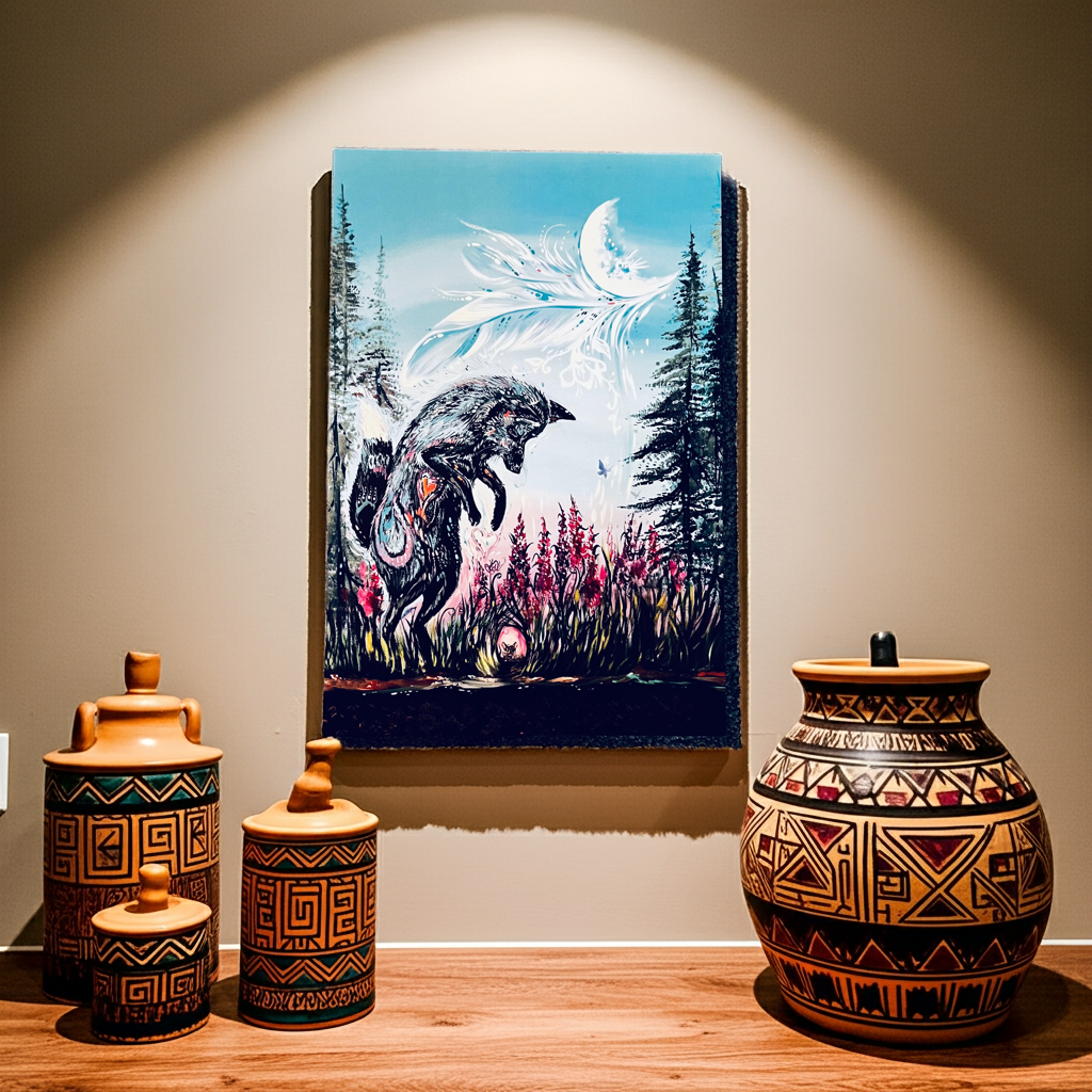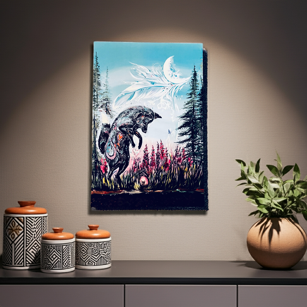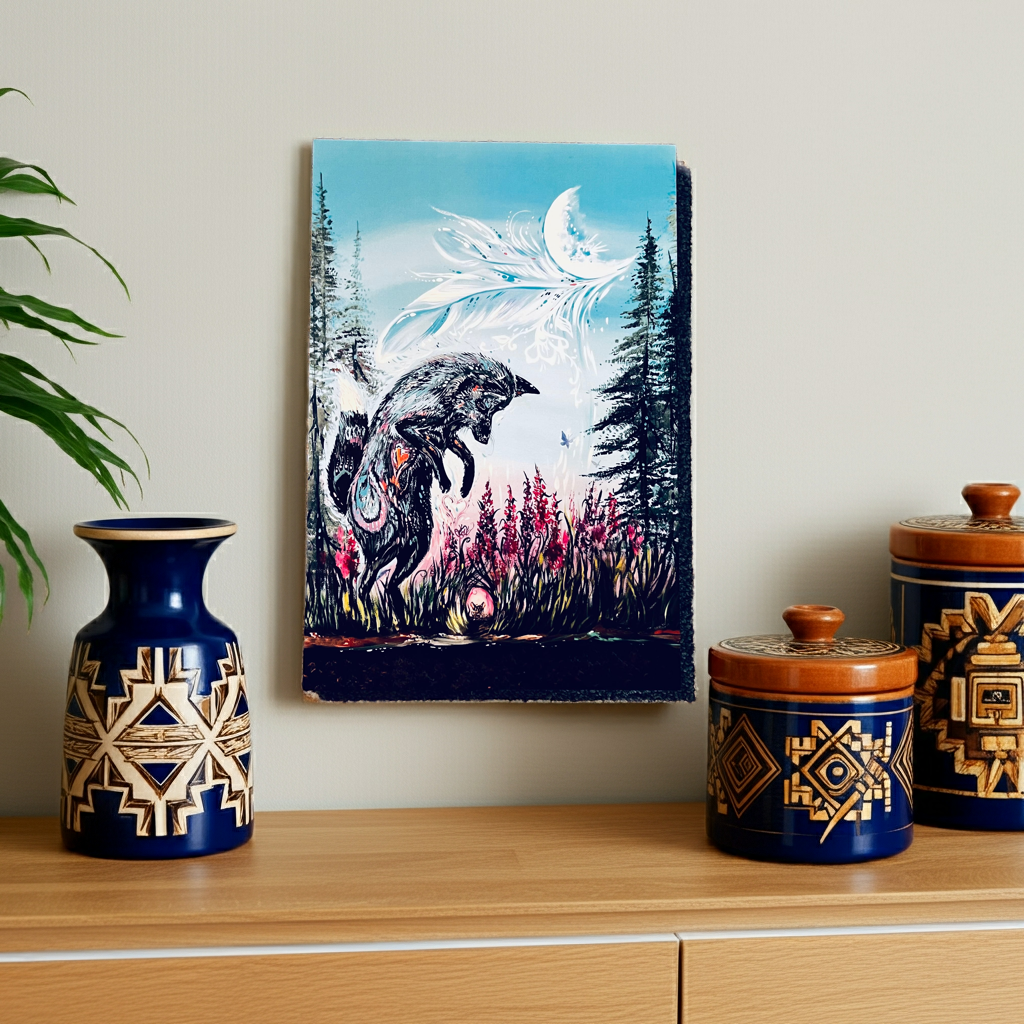 This 12"x18" plaque, measuring 17mm thick with a sleek black edge, offers a refined display for the captivating Chickadee Prayers artwork. Featuring the artist’s biography on the back, it honors authentic Canadian Indigenous artistry and makes a meaningful statement on any wall. Printed in Canada, it’s the perfect elegant finishing touch to celebrate Indigenous culture with sophistication.