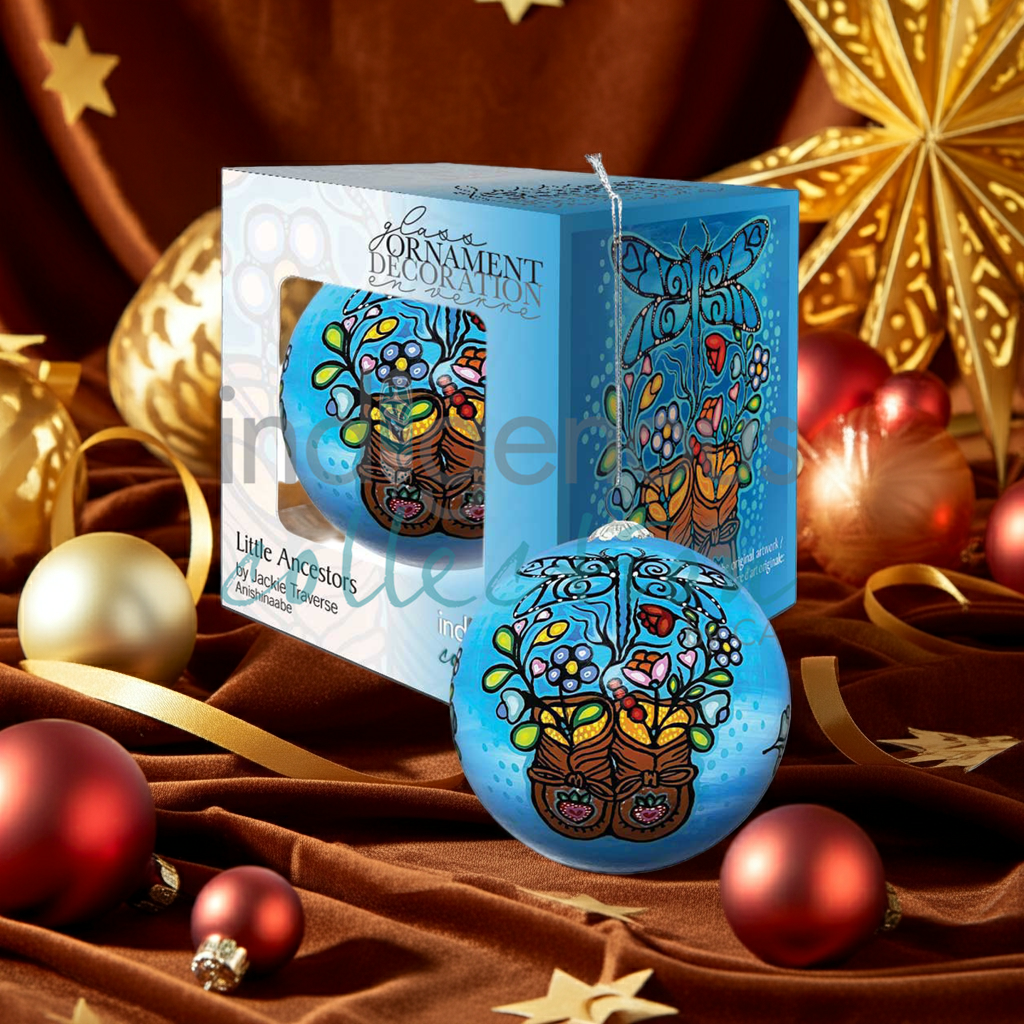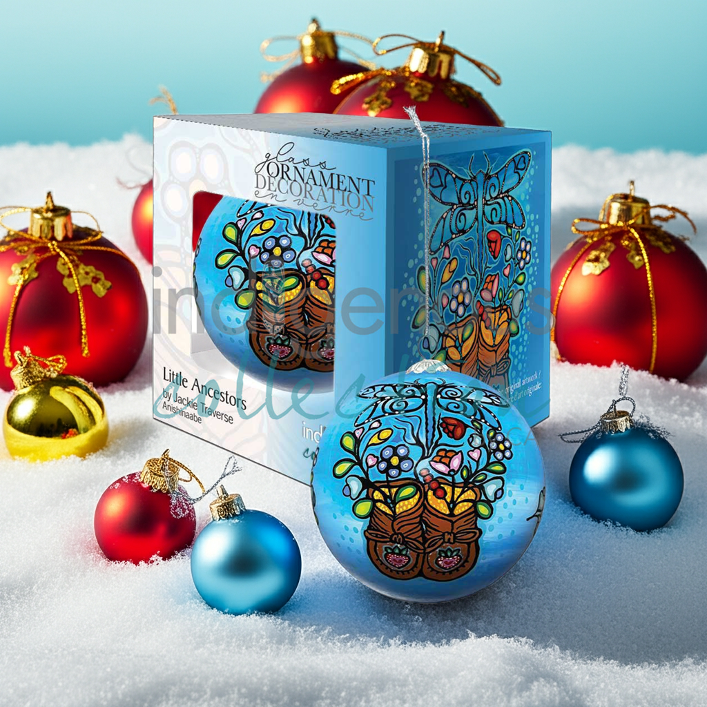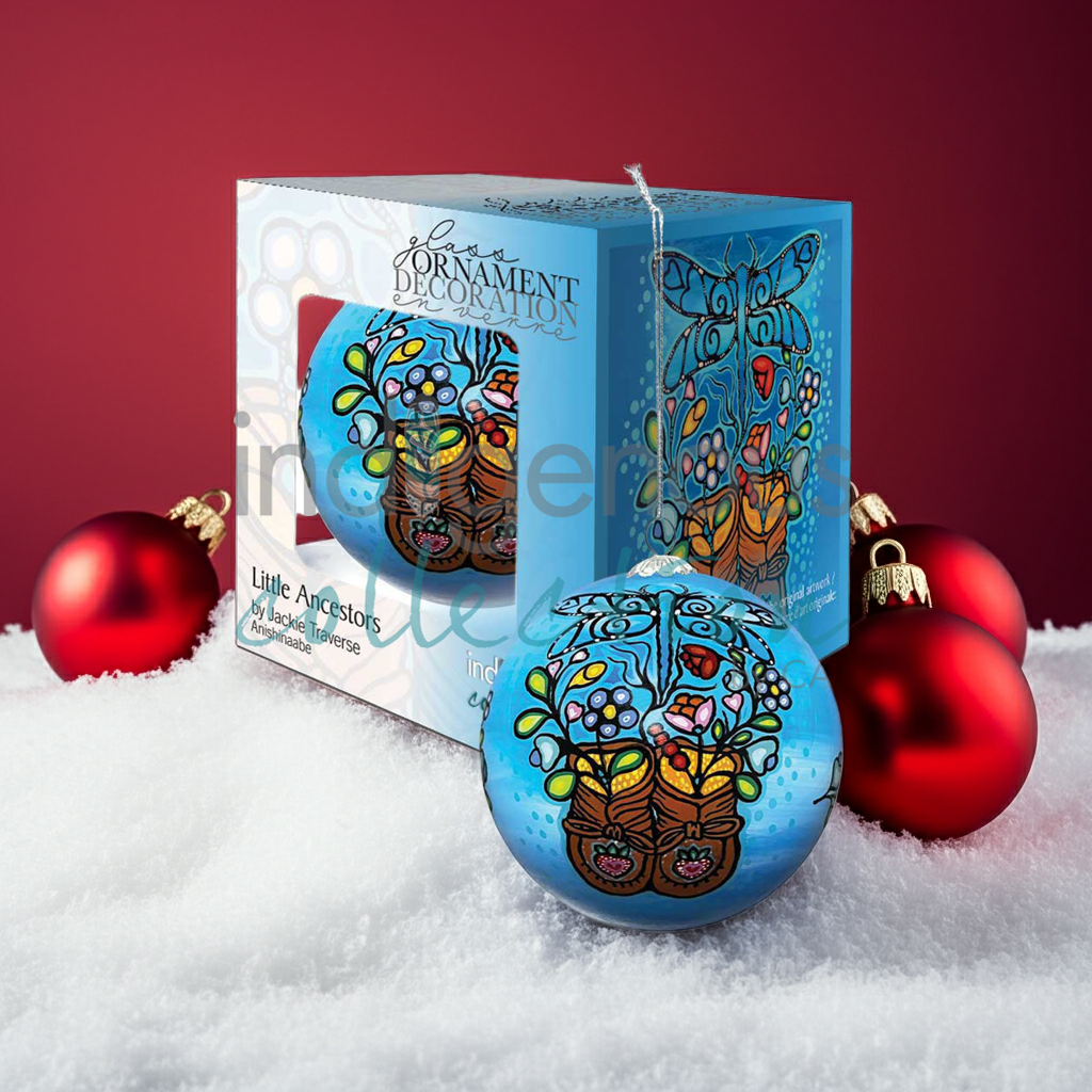 These exquisite ornaments, inspired by the original artwork of Artist Jackie Traverse Little Ancestors , make exceptional gifts. Crafted from hand-painted glass and measuring 80MM, they are a true symbol of indigenous beauty and artistry.