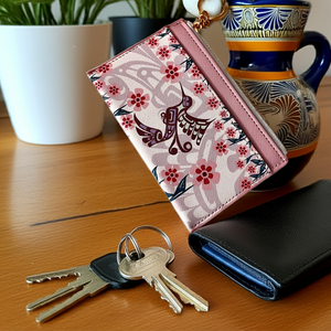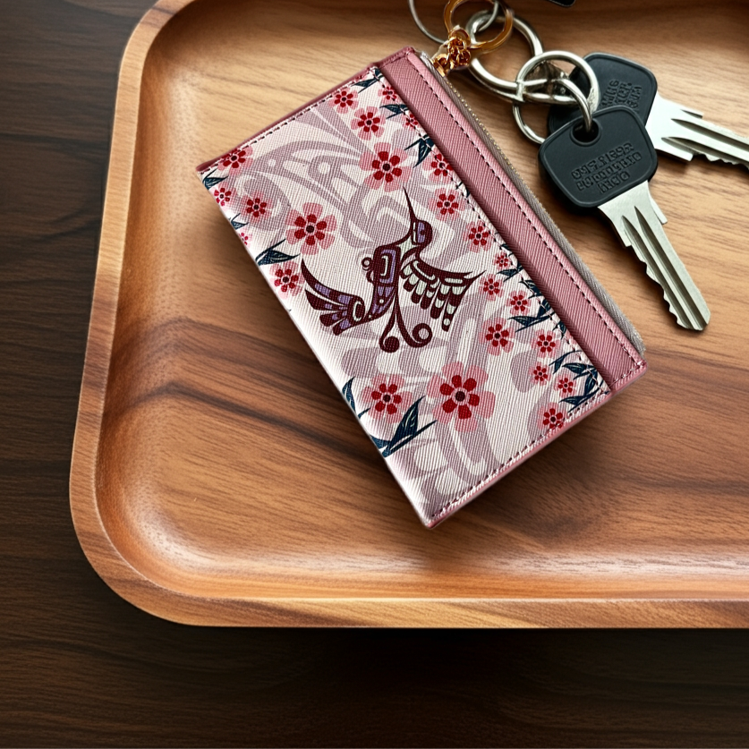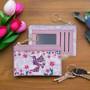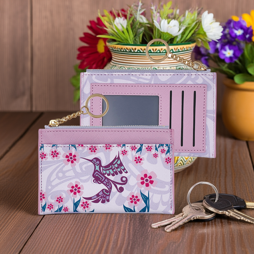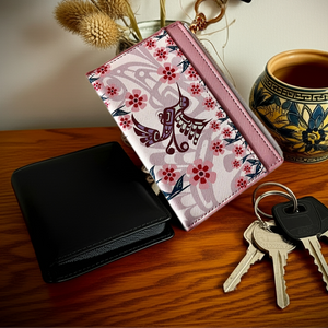 Crafted from premium vegan leather, this compact card wallet marries refined aesthetics with everyday functionality. The design accommodates three card slots, a zippered security pocket, and an accessible interior compartment—all within a streamlined 5.325" x 3.5" footprint. Adorned with striking Indigenous artwork, it serves as both a practical accessory and a meaningful expression of cultural artistry, equally suited to personal use or as a distinguished gift.