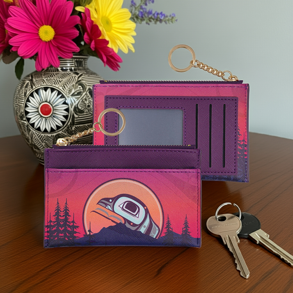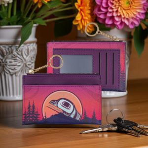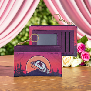 Stay effortlessly organized with the New Zippered Card Wallet - The Light Keeper. Made from 100% vegan leather, this elegant wallet offers three card slots, a secure zippered compartment, and an open pocket for easy access to essentials. Its compact 5.325" x 3.5" size combines practicality with refined style, featuring exquisite Indigenous artwork that honors cultural heritage. Ideal for daily use or as a thoughtful gift, it seamlessly merges sophistication with meaningful design.