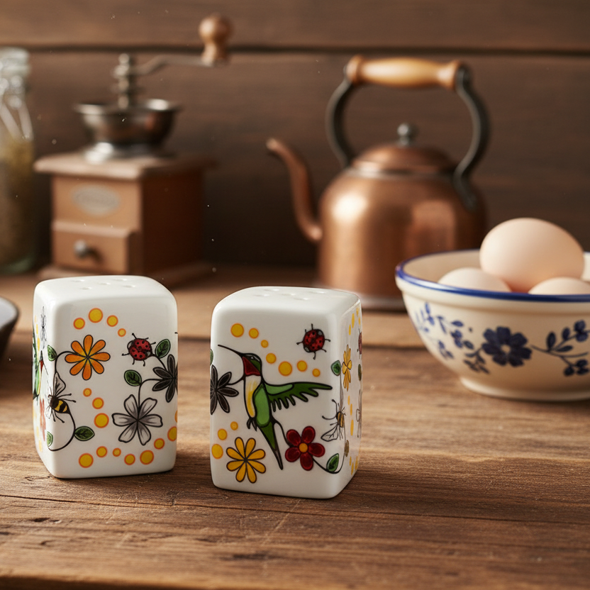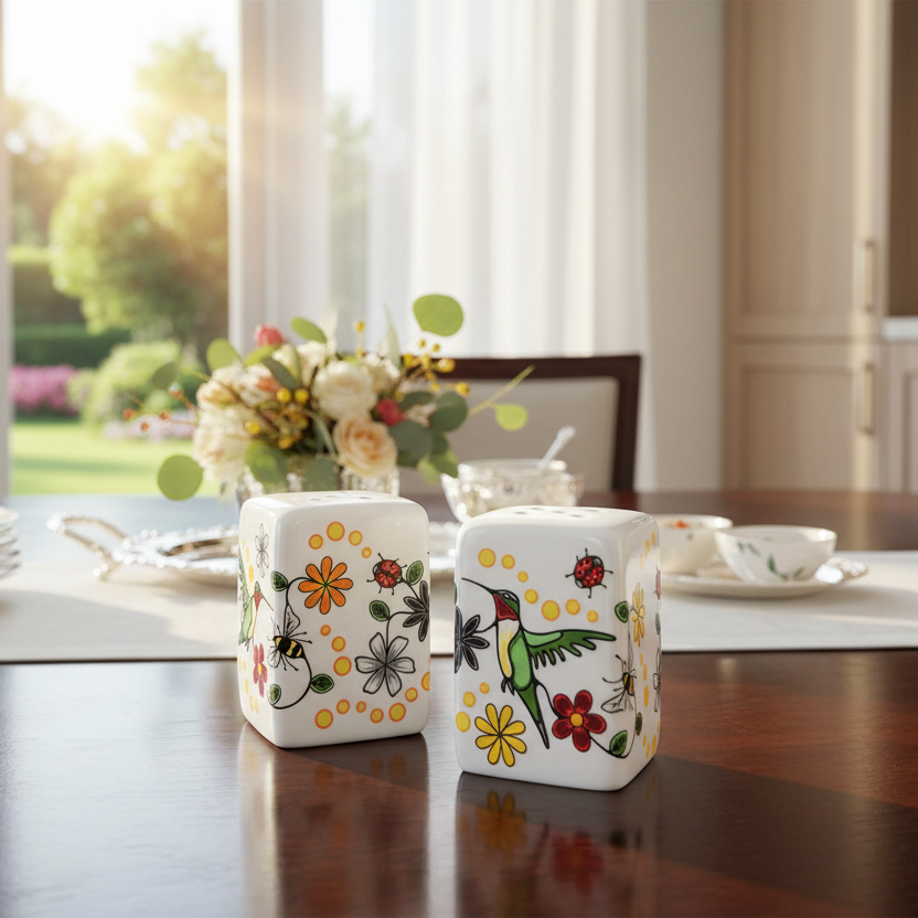 This elegant ceramic Salt and Pepper Shaker Set features the Hummingbird (Nenookaasi) design by artist Storm Angeconeb, Lac Seul First Nation, Ojibwe.