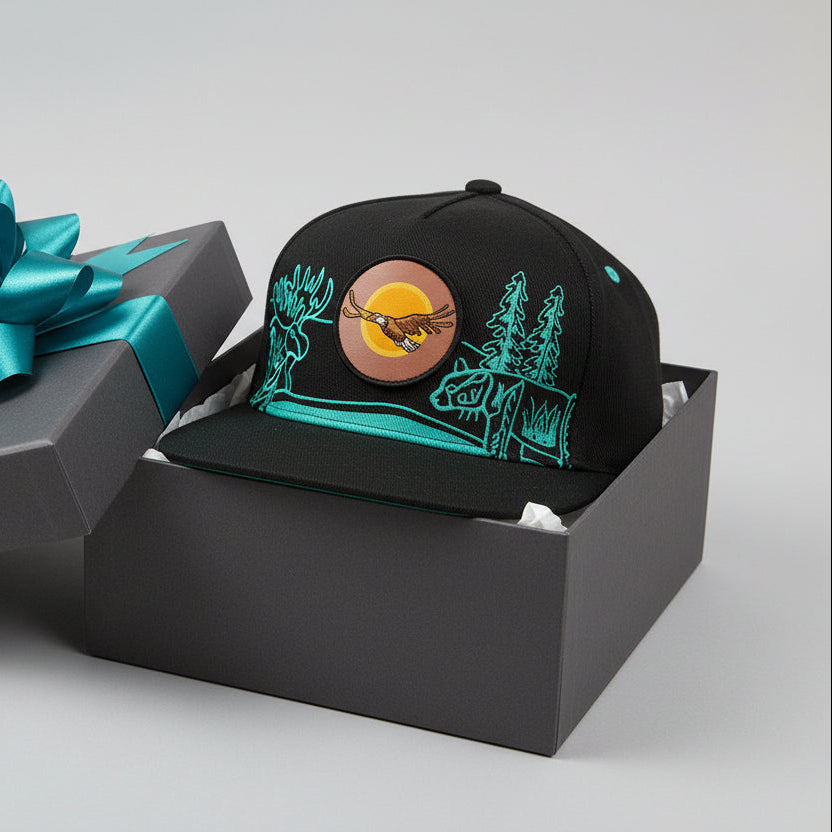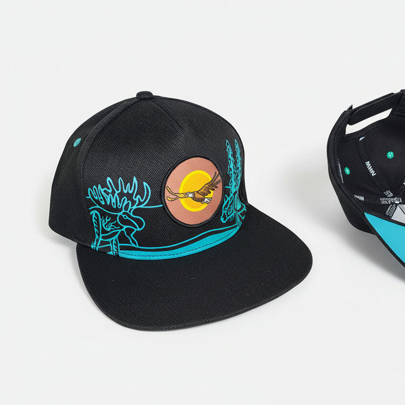 • Indigenous artwork by Storm Angeconeb on flat brim and front panel