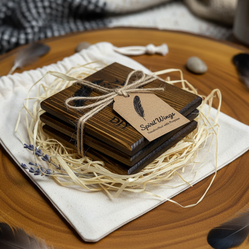 Embrace the spiritual journey with our Spirit Wings Art Coasters featuring a beautiful feather design with birds taking flight. Each set of 4 coasters is handcrafted from premium pine wood and finished with a rich walnut color oil-based stain to bring out the natural grain and warmth of the material.
