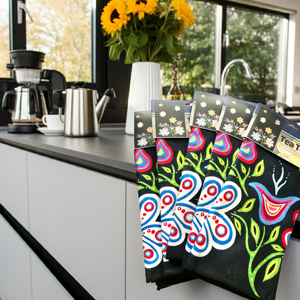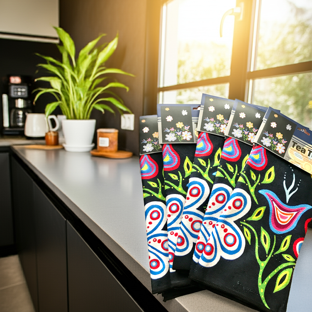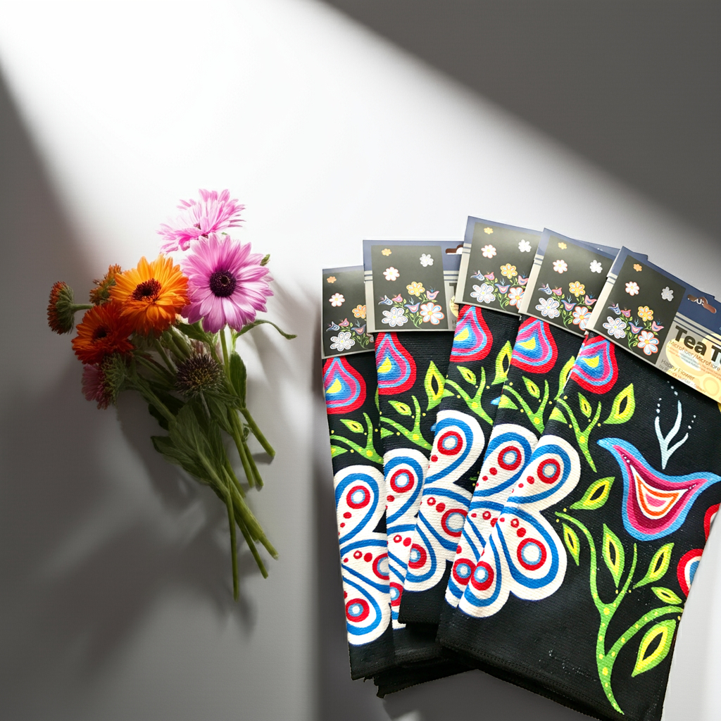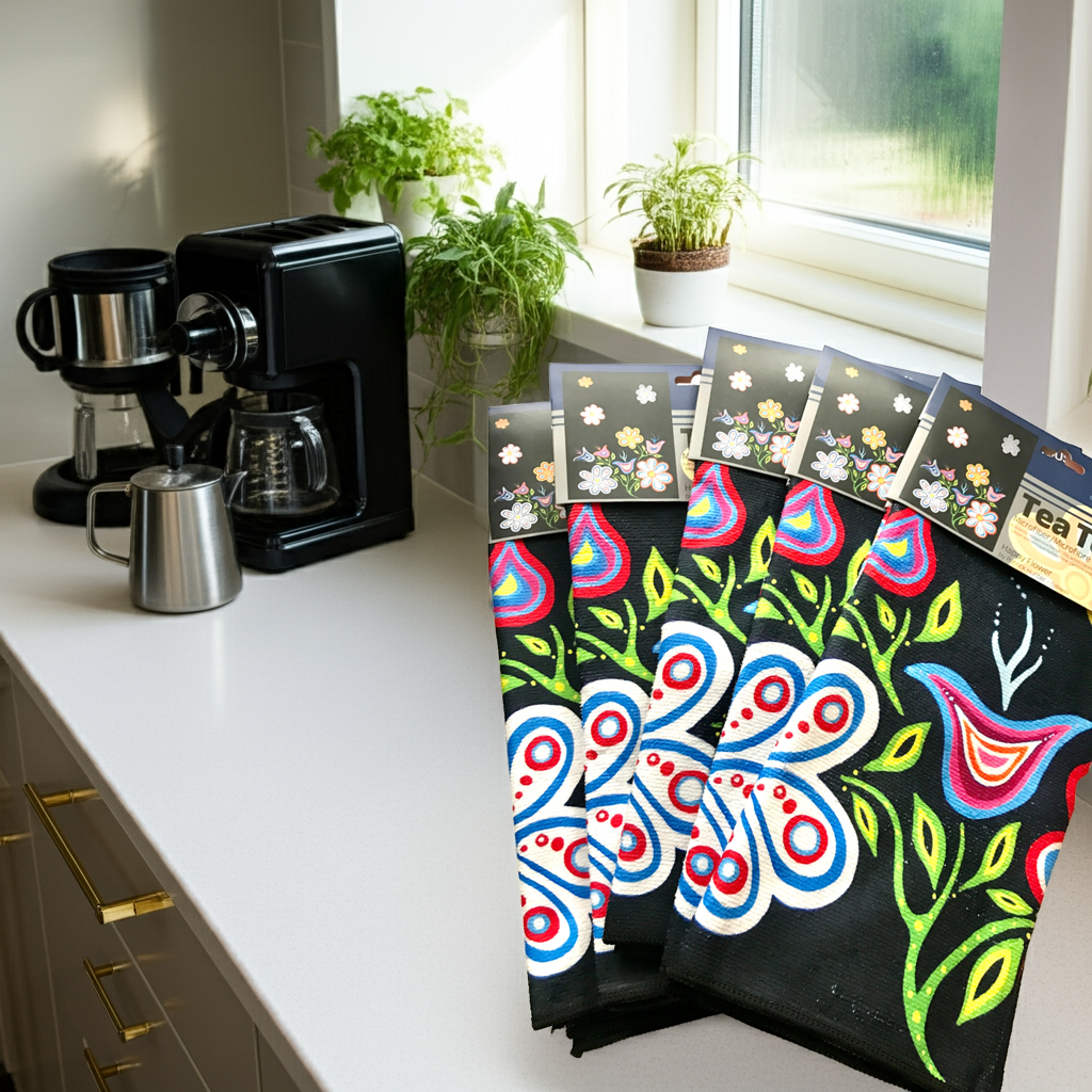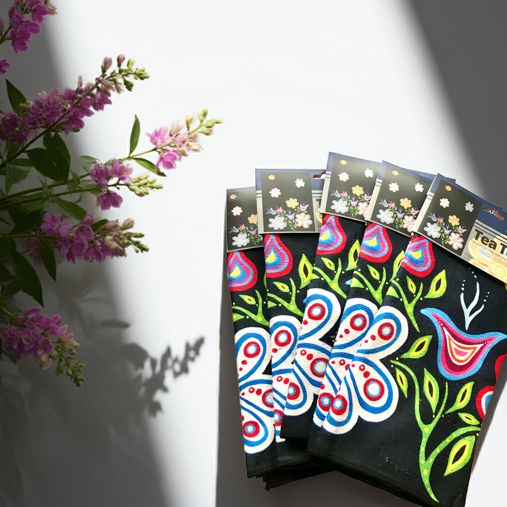 These beautiful tea towels feature authentic Indigenous artwork celebrating the joyful Happy Flower design. Perfect for adding a touch of artistry to your kitchen while honoring Indigenous culture and craftsmanship.