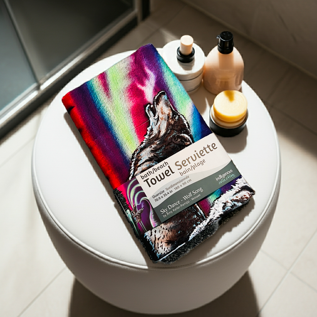 Introducing our luxurious Bath Towels - Sky Dance Wolf Song Measuring 70.9"x35.4", these indigenous designed towels are crafted from 100% polyester micro fibre for an ultra-soft and absorbent experience. Perfect for both bath and beach, this huge towel makes an excellent gift and adds a touch of elegance to any bathroom. Treat yourself to the oversized comfort of our Bath Towels.