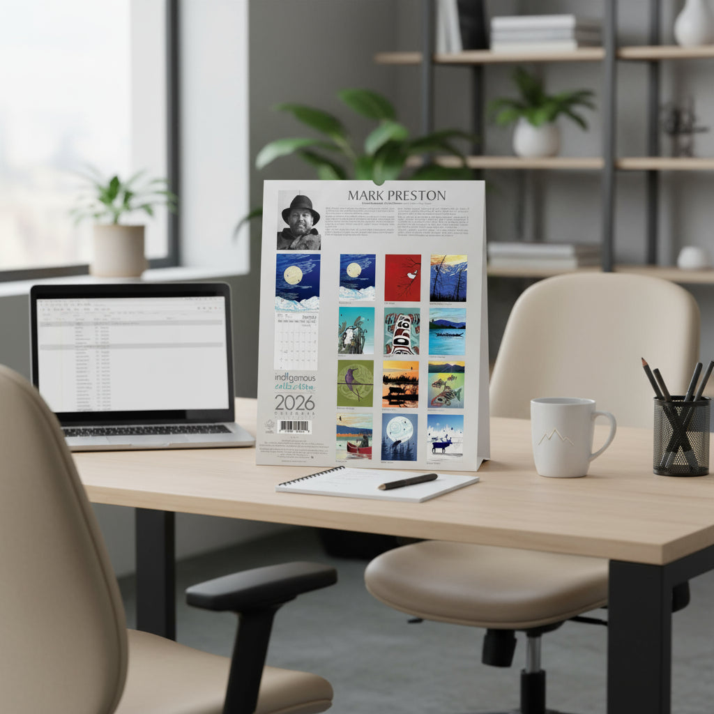 Celebrate 2026 with this exquisite wall calendar featuring the stunning artwork of Mark Preston, a renowned Canadian Indigenous artist. Each month showcases a unique piece that brings cultural richness and artistic elegance to your space. Proudly printed in Canada, this calendar not only honors Indigenous creativity but also supports the artist through royalty payments on every sale. Perfect for those who appreciate art and culture, it offers a refined way to organize your year.